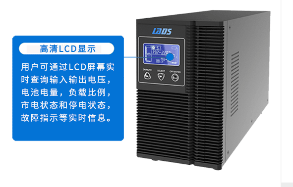 用戶可通過LCD屏幕實(shí)時(shí)查詢輸入輸出電壓,電池電量,負(fù)載比例,市電狀態(tài)和停電狀態(tài),故障指示等實(shí)時(shí)信息。