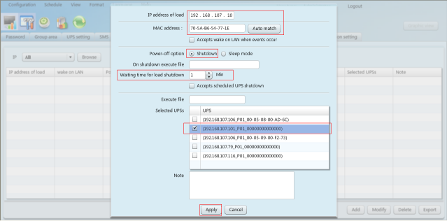 2. 輸入負(fù)載的IP地址,MAC地址,選擇電源關(guān)閉選項(xiàng),輸入關(guān)閉負(fù)載的等待時(shí)間,選擇UPS,然后點(diǎn)擊“應(yīng)用”按鈕,參見圖2-1。