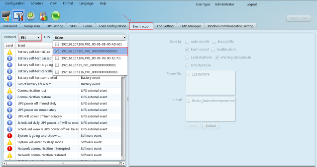 3. 轉(zhuǎn)到事件動(dòng)作頁(yè)面,然后選擇協(xié)議,UPS和事件,如圖3-1所示。例如,選擇“交流故障”事件,然后選擇發(fā)送類型,選擇負(fù)載關(guān)機(jī)、UPS關(guān)機(jī)、輸入負(fù)載關(guān)機(jī)等待時(shí)間、負(fù)載關(guān)機(jī)提醒、關(guān)機(jī)前彈出的對(duì)話框、警告對(duì)話間隔、UPS關(guān)機(jī)等待時(shí)間,然后點(diǎn)擊“應(yīng)用”按鈕,參見圖3-2。